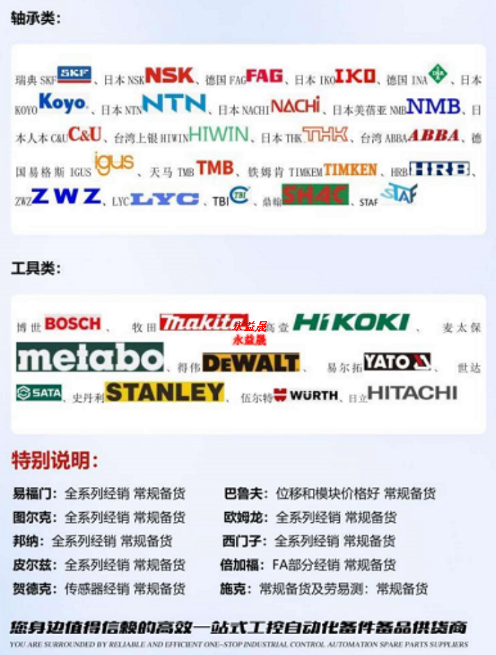 一、自动化控制元件:喜开理CKD(代理),宜丽客ELECOM,PISCO(代理)、今尾IMAO、SMC、米思米MISUMI、山武AZBIL YAMATAKE、欧姆龙OMRON、小金井KOGANEI、藤仓FUJIKURA、东崎TOKY、千代田通商CHIYODA、不二越 NACHI、MIRAI未来工业,横滨YOKOHAMA,THK,SUS电缸,日开NKK,索尼MAGNESCALE,伊东ITOH,IDEC和泉;